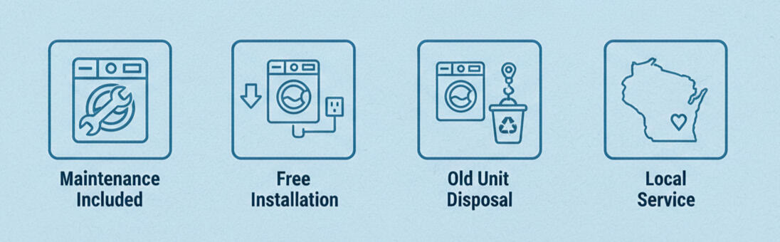 At Madtown Machines, we believe that clean clothes shouldn't come with a massive upfront price tag or the hassle of the laundromat. We started this business to provide Madison residents, from UW students to local landlords with a reliable, affordable, and stress-free alternative to appliance ownership.- Maintenance Included: If it stops spinning, we’re on our way. No extra fees for repairs.- Free Installation: We handle the heavy lifting and hookups.- Old Unit Disposal: We deal with the removal and disposal of old units.- Local Service: Locally owned and operated right here in Madison.