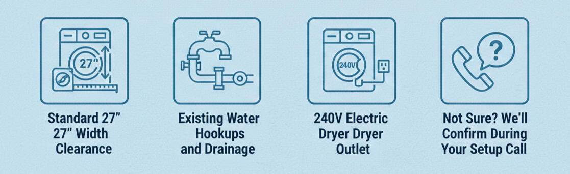 - 240V Electric dryer outlet.Not sure? Take a photo and text us!